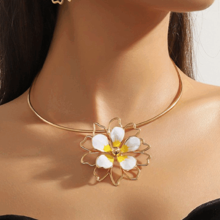 This elegant choker features a delicate floral motif with small, pink enamel or resin blossoms interspersed along a gold-toned chain, centered by a rhinestone-studded clasp or accent. Cascading double gold chains drape gracefully below the main garland, adding a romantic, layered look.
