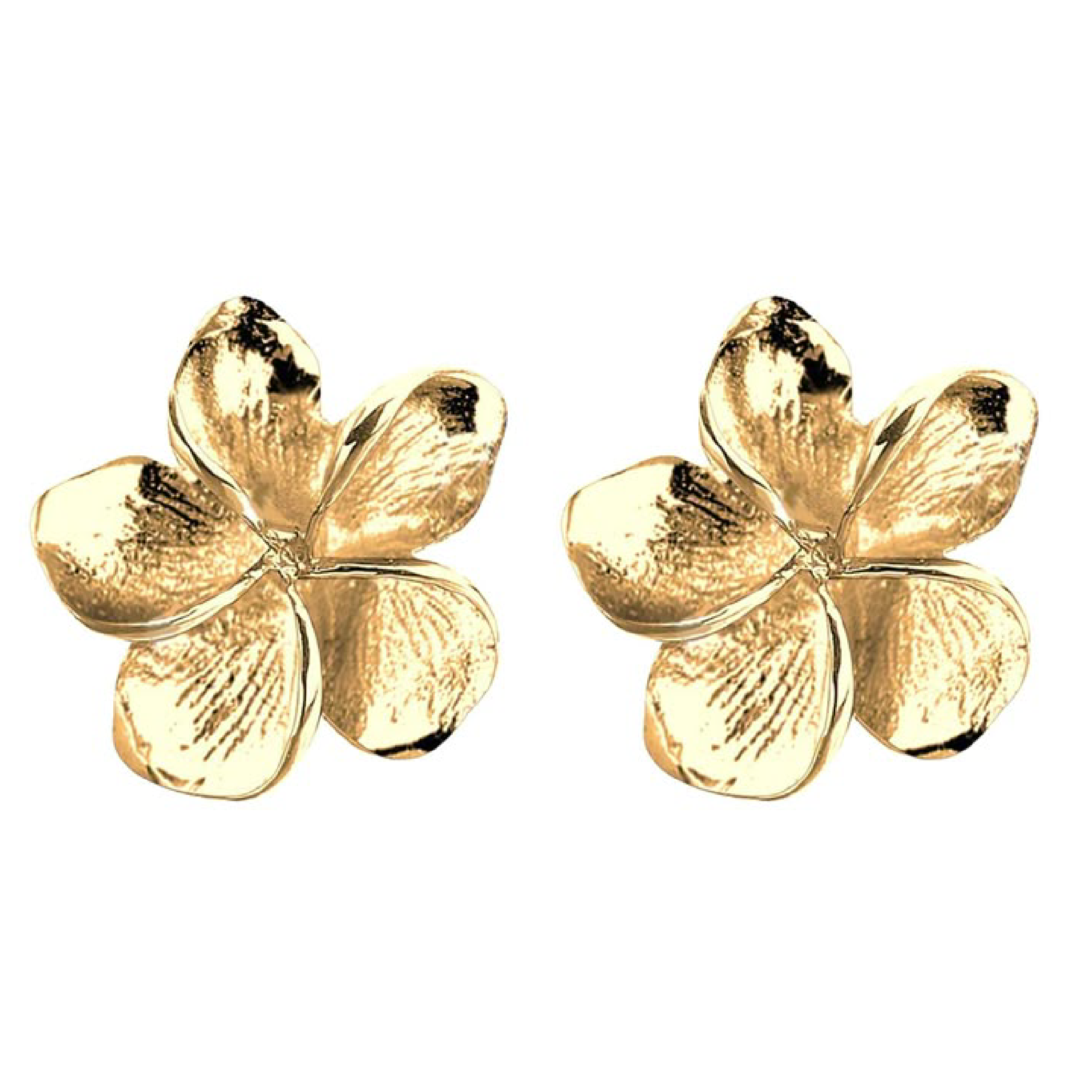 These earrings feature a five-petal floral design crafted in a polished gold tone, with subtle texture on each petal that adds depth and a natural, elegant look